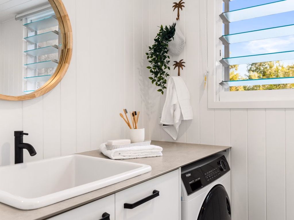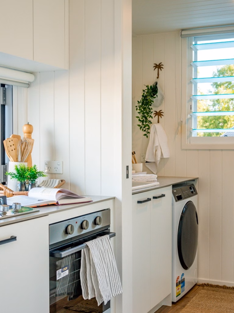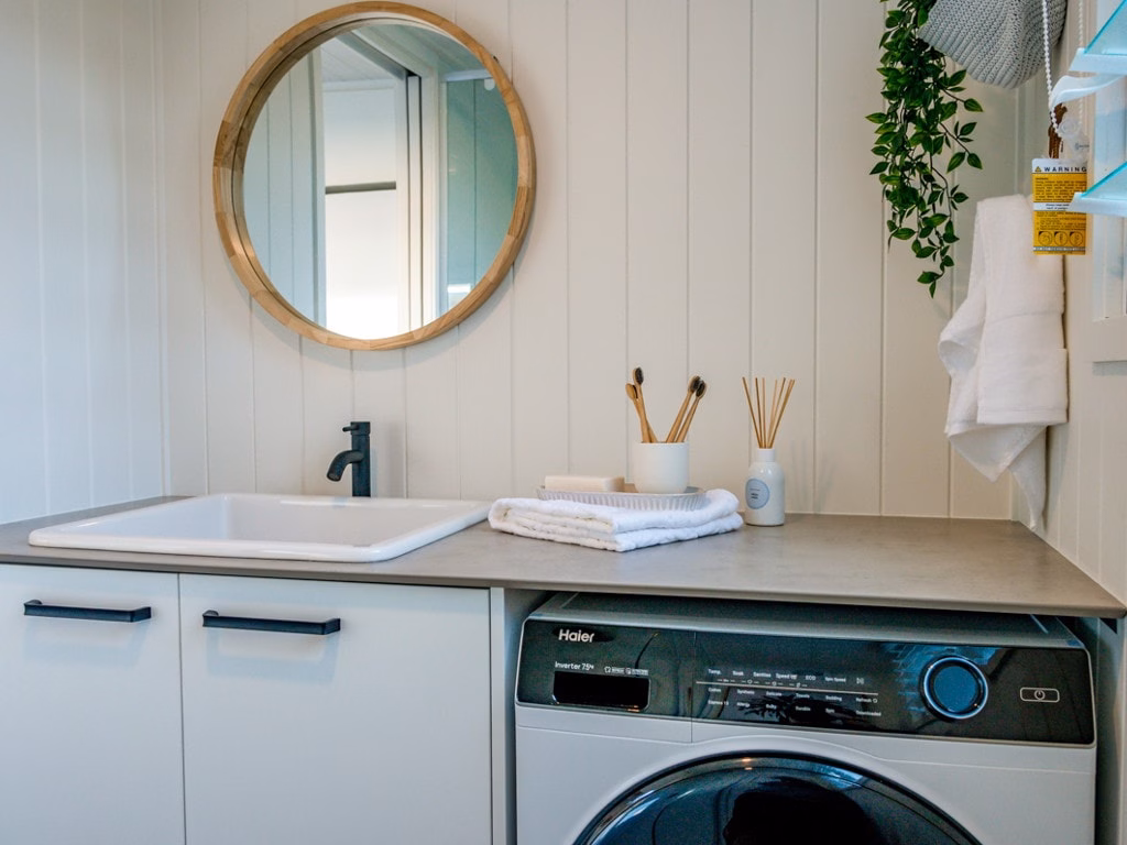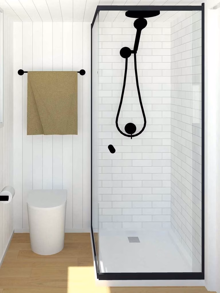 Right next to it, the bathroom is designed with practicality in mind. Thereโs a spacious vanity, room for a washing machine, and additional storage. Buyers can customize features like the toilet type or add extras depending on their needs, and there are also options for off-grid living with solar systems, which is great for those looking for more independence.