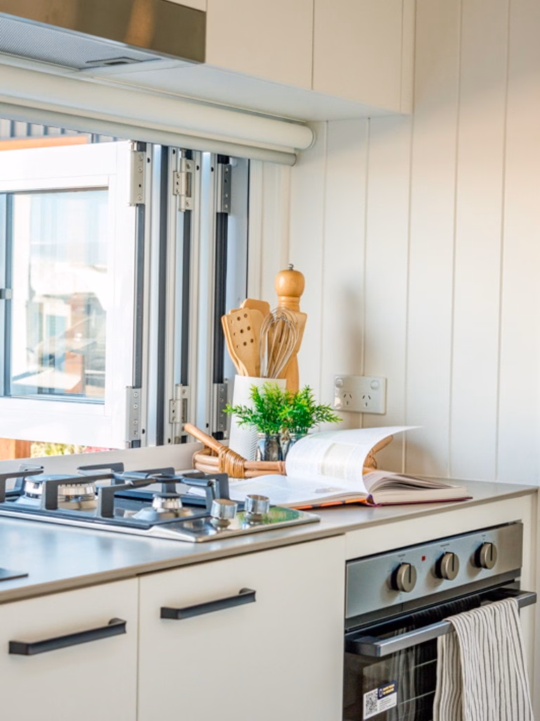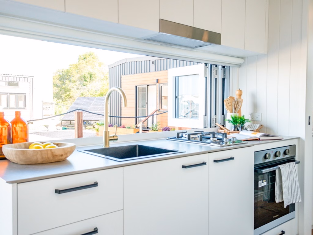 That indoor-outdoor flow continues into the kitchen, which features a bistro-style window that opens completely to the outside. Itโs perfect for serving food to an outdoor deck or just enjoying fresh air while cooking. Inside, the kitchen is well-equipped with plenty of storage, quality finishes, and options for full-size appliances if you want to upgrade.